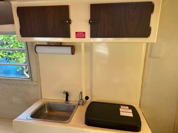 I restored this trailer to be towed by EVs or 4 cylinder cars and kept the weight to an absolute minimum. She weighs less than 1,000 pounds and barley impacted my MPG on a recent camping trip. With that said, fridge, furnace, propane tank, 12v battery were removed and replaced with cabinets, Aluminum tongue box and a large countertop for more storage and more convenience. Brand new Flame King 2 burner cooktop with 1 pound propane tank. 110v system powers the light above the sink (with outlet) and an outlet under the counter should you want to install a fridge.