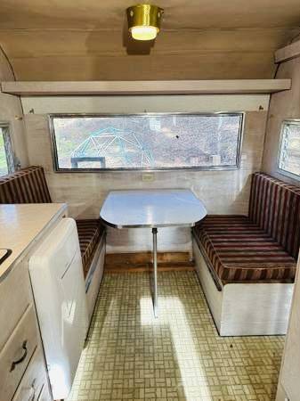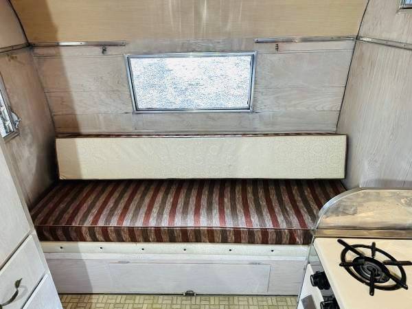 This 1966 Aloha Model 15 King is a 15′ single-axle travel trailer. The floor plan features a sleeping area, a kitchenette, and a dinette with bench seating trimmed in striped cloth upholstery. Amenities include a sink, a range, a furnace, and vinyl flooring, while chassis equipment consists of dual propane tanks, electric brakes, and a tongue jack. Invested in polishing the exterior, reinforcing the frame, and installing a modern refrigerator, freshwater connections, and LED marker lights.