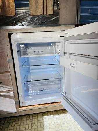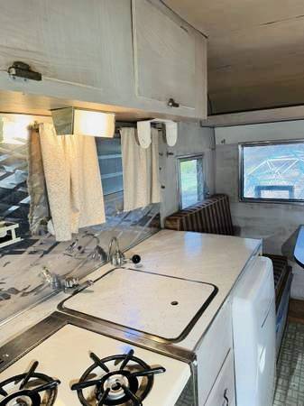 The kitchenette is outfitted with a three-burner propane range, a porcelain sink with a cover, a pantry, an aluminum backsplash, drawers, curtains, and overhead lighting. The refrigerator is brand new and never used. New tiers, new refrigerator and new LED market lights from vintage trailer supply. Tires are brand new with less than 2 miles on them.