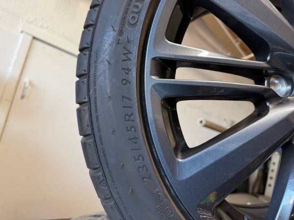 17in Stock wheels from a 2021 Subaru WRX base. With TPMS already installed. Makes for a great winter/summer set to swap out as needed. Wheels are in great condition, tires are pretty worn. Advise getting new tires and popping them on these wheels for a second seasonal set. I used to swap these with winter tires and so forth. Just have shop sync the TPMS though.