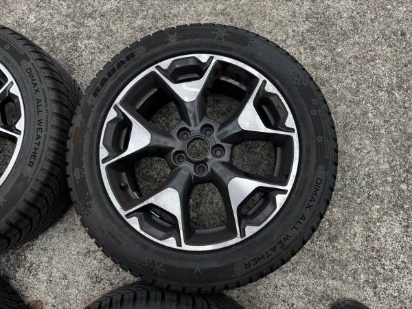 Selling a set of 17” wheels and tires for Subarus. Tires at almost new with less than 5k miles on them. Wheels have no bends or major rash. 5x100 17x7 +55 215/55/17 Radar Dimax All Weather tri peak...