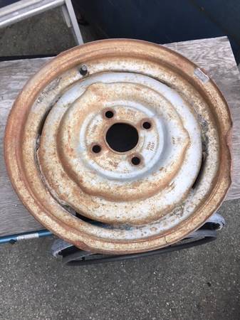 BMW Stock steel 13" BMW rim, 4x100x 4.5 bolt pattern, not bent, one was bead blasted and painted, ready to mount and drive, = also have another same rim, but this one is bent on the lip, still fixable by JIM, in San Bruno Wheel Service, bent wheel, $225 for both.