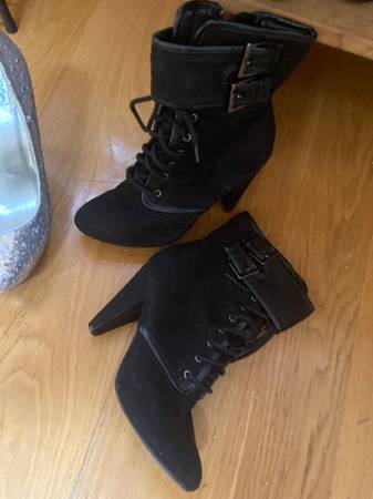 High Heel Lace-Up Black Booties, Size 7 Short Motorcycle-Style Black Boots, Size 9 Tall Spike Heel Sparkly Silver Shoes, Size 9 After we've emailed (no texts please), if you tell me WHEN you can...