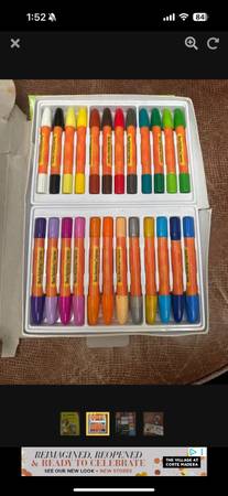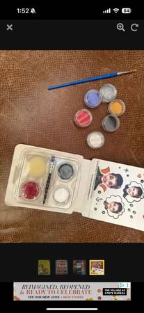 A few sets of face paints- the first photo of the green package was lightly used- most of the colors were never used. The second set of the black package was also partially used (clearly the white & purple were), and the 3rd set with the small package and pots of color were never used.