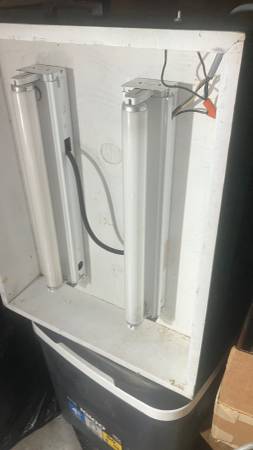 The light box is two fluorescents about 1.5’ long each, and is wired with a power cord and toggle switch. The color of them in the pic isnt what it truly is, it’s just my phone taking the pic while they’re turned on, you know how it does that thing, kinda like taking a pic of the tv. …. Put a cover of some sort, semi-transparent, white for the brightest, or colored for fun stuff!