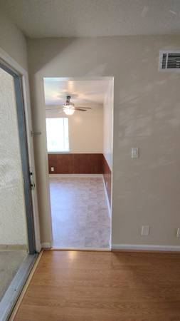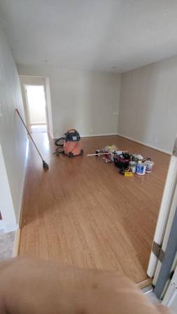Laminate floors in living room/hallway, vinyl in kitchen/dining room/bathrooms, carpet in bedrooms