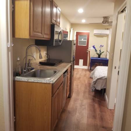 Furnished studio in Cupertino, Separate entry + fenced private yard, Small but fully equipped kitchen with new stainless steel appliances including range, dishwasher, garbage disposer, filtered drinking water faucet, built-in microwave oven, coffee maker, Air Fryer, Toaster, Kettle, and more. Washer and Dryer in unit.