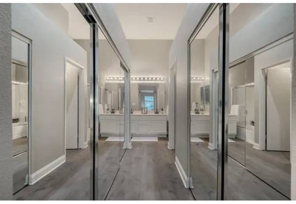 The stunning master suite creates a resort-like oasis with high ceilings, a long hall of mirrored closets, and a spa-style bath complete with double sinks, oversized soaking tub, and separate shower.