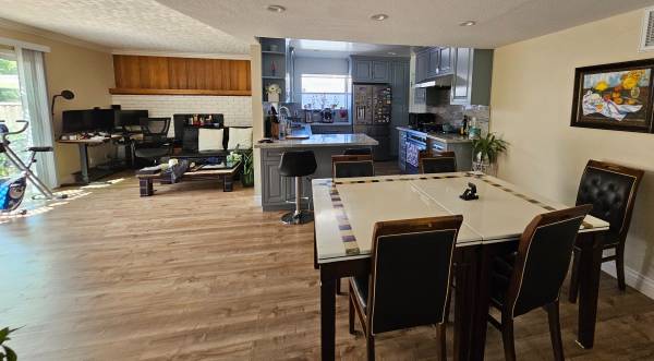 • Modern kitchen equipped with refrigerator, dishwasher, stove, range hood, and microwave