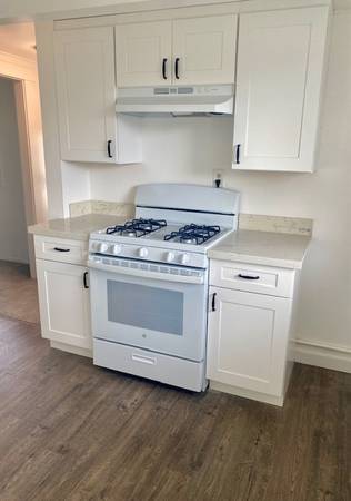 Recently remodeled kitchen with new cabinets, white quartz countertops, farmhouse sink, gas range, dishwasher, and designer faucet