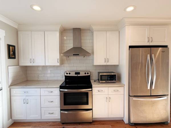 * Fully equipped kitchen with refrigerator, dishwasher, and microwave