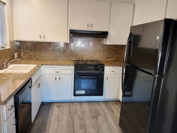 Kitchen with porcelain sink, granite counter top, disposal, dishwasher, stove, fan, refrigerator; bathroom with shower over tub. The apartment is on the 1st floor of a 4-plex. The shared laundry room is also on the 1st floor. There is a front yard and small side yard for BBQ.