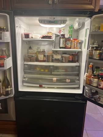 Working fridge in great inside/outside condition. Top refrigerator and bottom freezer. Cools well when not overloaded, but when it's packed the temperature goes up, not sure what the issue is.