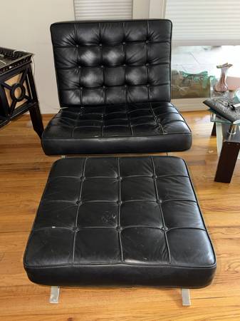 Stylish black leather lounge chair with matching ottoman. Modern / mid-century inspired design with tufted cushions and chrome base. Shows light wear consistent with normal use but remains very...