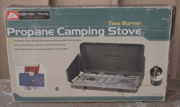 For sale is a portable cooking stove for outdoor or camp use. Specifically, this is a Ozark Trail brand, model number 842-A100-W. This portable stove uses propane from standard, small, 1-pound metal canisters as a fuel source. This is a two-burner type. Each burner is roughly 4 inches in diameter with 10,000 BTU energy output. This does NOT have any ignition switches, so you must use matches to start the fire. This has a removable metal mesh top that holds the weight of heavy pots and pans. This has a removable propane gas regulator that connects the fuel cylinder to the burners.