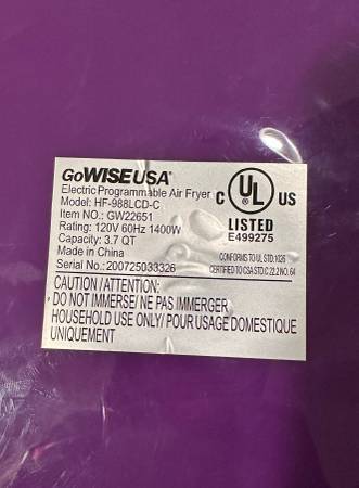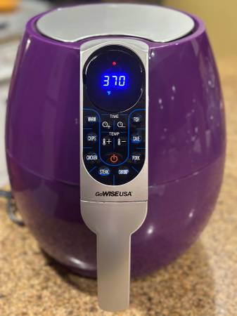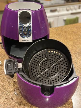 Barely used 3.7qt air fryer with digital controls and 8 cook presets. Has a removable basket and pan. Works great Purple color!