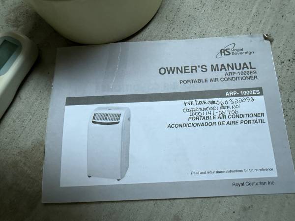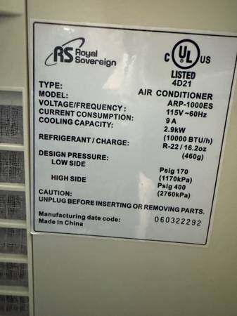 Royal Sovereign Portable Air Conditioner - ARP - 000ES - With Attachments and Remote 10,000 BTU's.