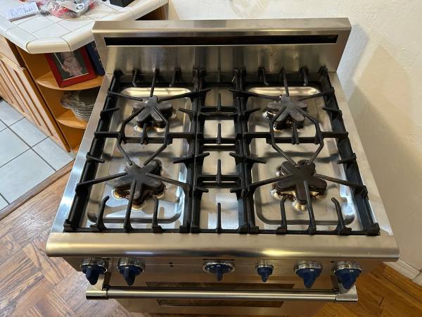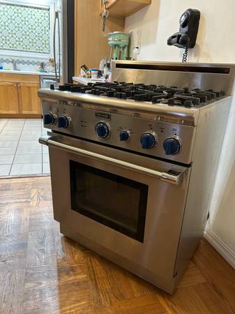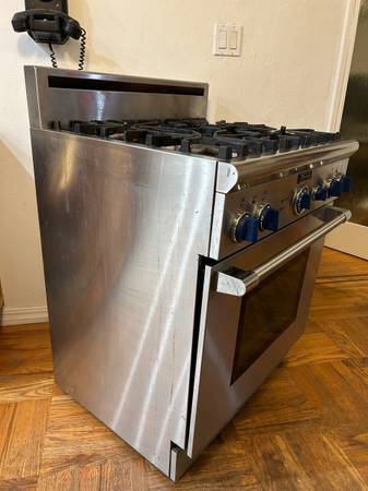 This 30" slide in P304CS/01 Thermador Professional Gas Oven/Range has been used for 20 plus years. The oven stopped heating. A repair guy said that the oven cooling fan and interlock switch need to be replaced. He also said that there is a control board that might also need to be replaced, but he thought the first solution would take care of it. I am selling it so someone can either fix it or part it out and recycle the steel. There’s definitely value in this oven’s parts.