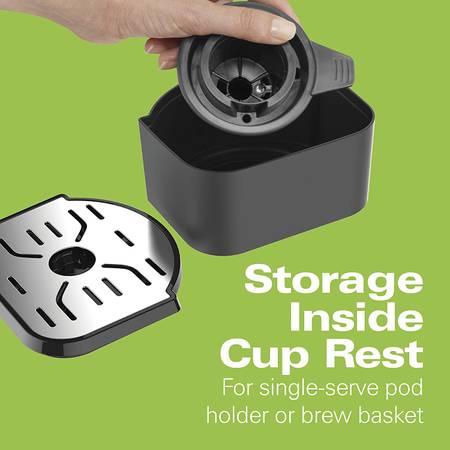 - Storage area inside cup rest for single-serve pack holder or brew basket
