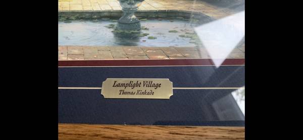 I am selling a THOMAS KINKADE "LAMPLIGHT VILLAGE" FRAMED AND MATTED LITHOGRAPH PRINT. This Kinkade is in nice condition. The frame is made of solid oak with glass. It is signed on the lower left and it has the metal plate on bottom center. The frame measures 22 1/2" x 16 1/2". I am selling this art for $60.00
