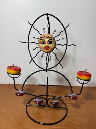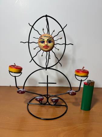 A beautiful hand made decorative sculpture / metal frame of candles, sun, stones, and religious cross produced in Puerto Vallarta Citi port in Mexico. I bought it as a souvenir. Btw, if you visited this city but missed the chance to bring a souvenir home, this is a chance to get it.