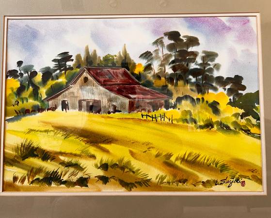 This is an original watercolor of a rural scene - rustic barn and golden fields by Lewis Suzuki. Estimated to have been painted in the 60s or 70s. Metal frame. Contains his signature and stamp. The frame is 22 x 28, and the watercolor painting is 14 x 21.