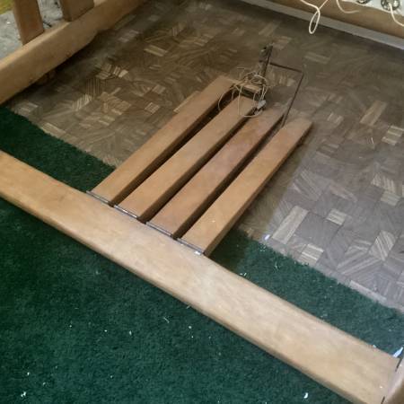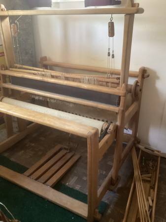 Sturdy wooden weaving loom. This loom was handcrafted in the 1930’s. It has 4 harnesses. It’s frame is 47” wide, 57” tall, and 42” deep. The metal grid the thread goes through is 42 1/2” wide. A picture of a box with implements associated with the loom is shown. We assume the weaving width is approximately 42”.