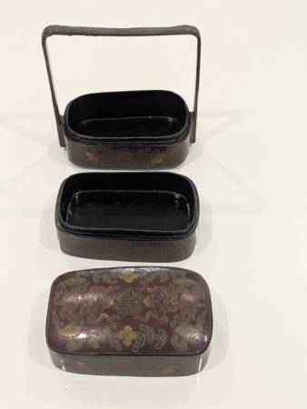 This elegant three-tiered lacquered stacking box is a beautiful and functional piece of traditional Asian craftsmanship. Measuring 8 inches wide, 7 inches high, and 4 inches deep, it features a dark lacquer finish with intricate golden floral and geometric patterns adorning the surface. The handle and frame provide ease of carrying.
