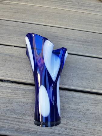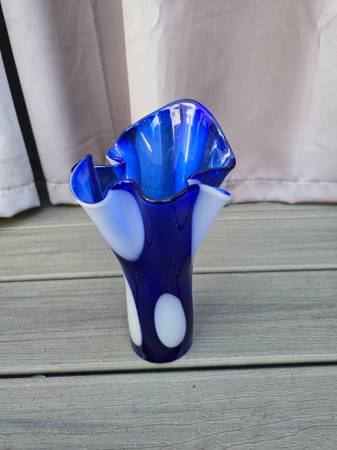 Beautiful Vintage Cobalt Blue And White Polka Dot Art Glass Handkerchief Vase 10” Flowers