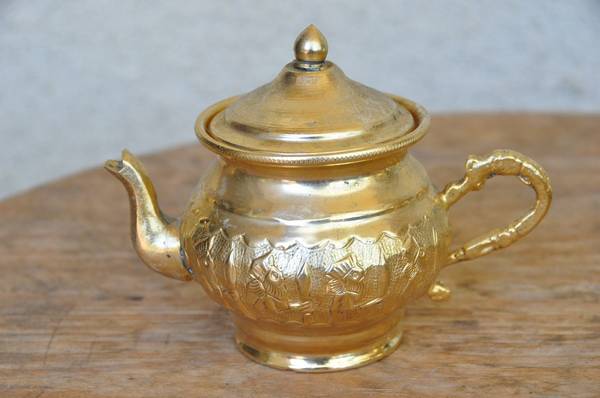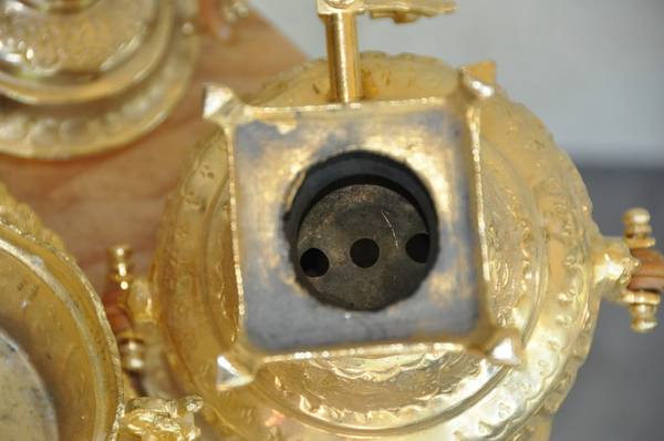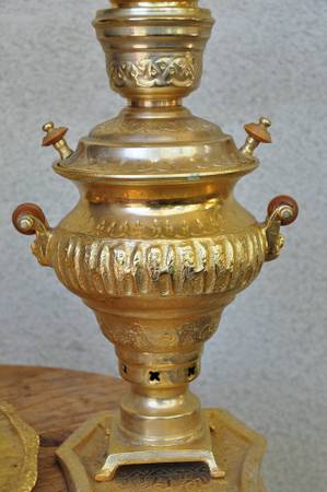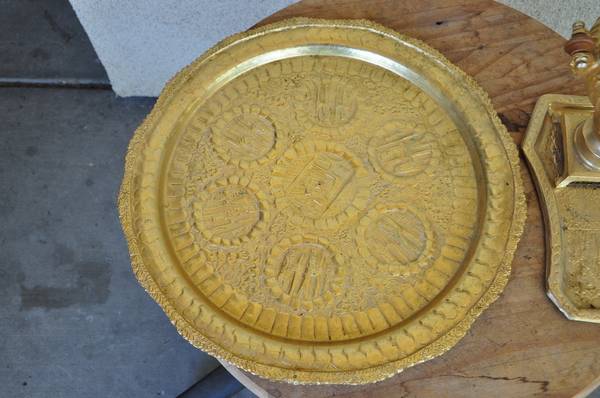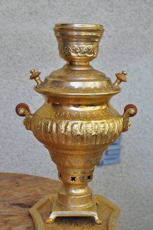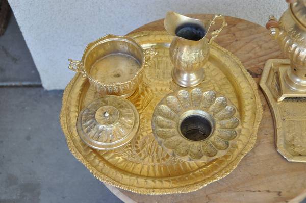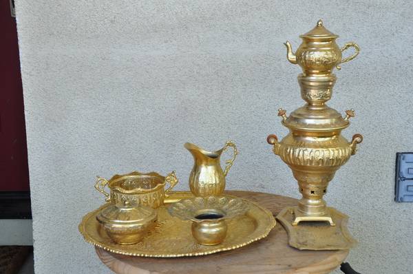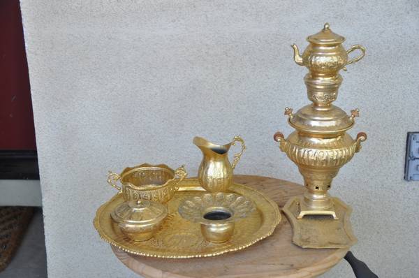 LOCATED IN SAN JOSE/SANTA CLARA. This is a decorative Persian samovar set with multiple pieces of accessories. Samovar is a metal container traditionally used to heat and boil water. It comes with matching tea pot, pitcher, several bowls and 2 trays. The samovar with the teapot on top is 15" high, 6.5" wide and the large round tray is about 14" in diameter. Asking $295 (OBO).