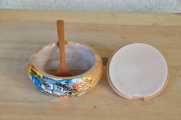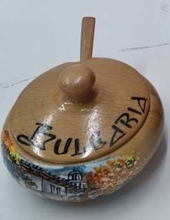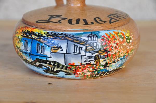 Hand painted carved wood bowl with lid and spoon from Bulgaria (OBO)...