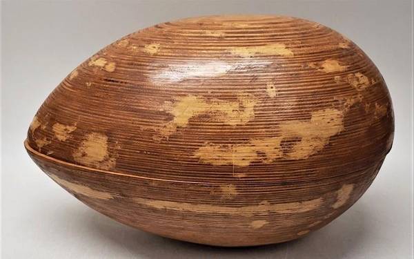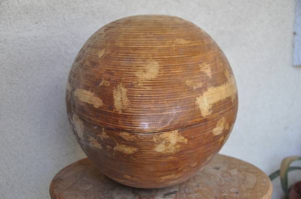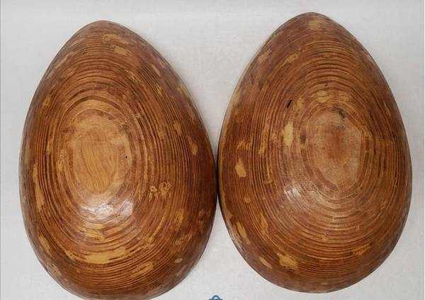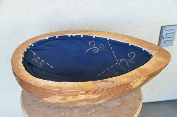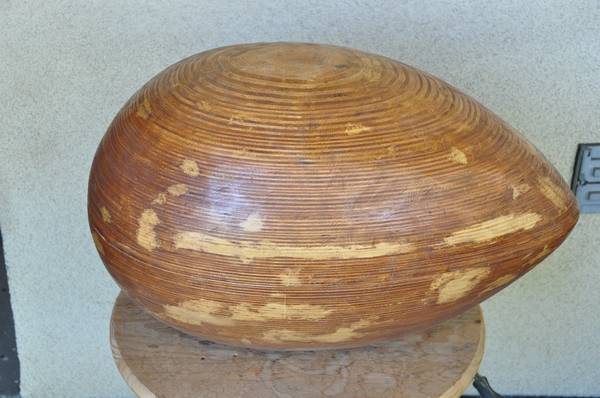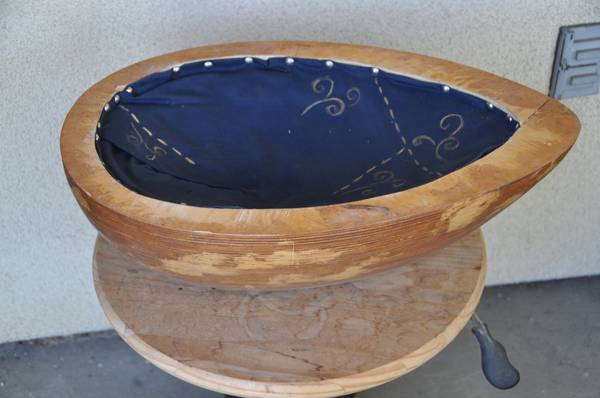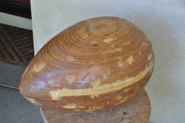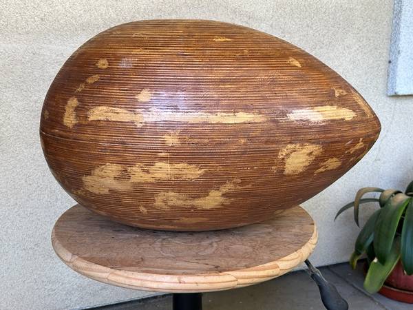 ITEM LOCATED IN SAN JOSE. The inner side of the egg is lined with blue fabric and some cushioning material. I am not sure what the original purpose of the egg is, but it will be great as a decoration piece. The two piece wood egg is 21.5" wide, 14" high, 14" deep and weigh about 21 lb. Asking $195 (or best offer).