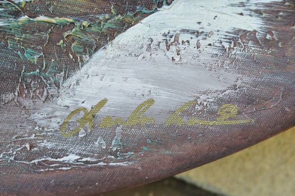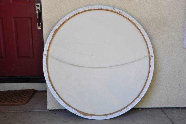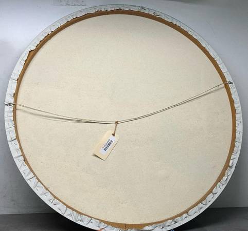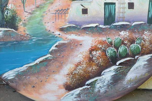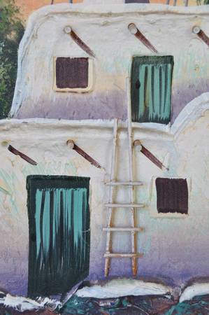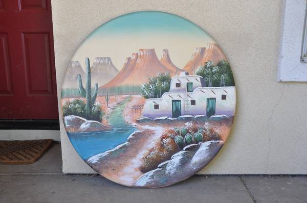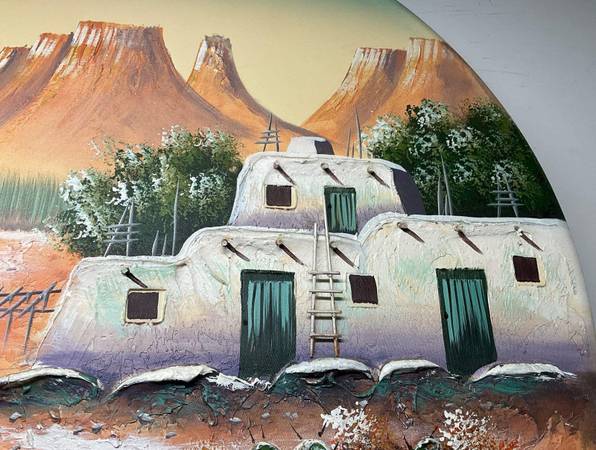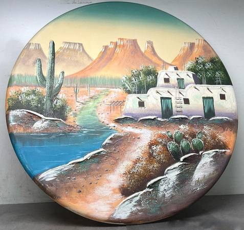 ITEM LOCATED IN SAN JOSE. This is an original mixed media painting depicting a Pueblo home in a Southwestern village with cacti and mountains in the backdrop. Some of the features are 3D in nature, such as the ladder/wall scaffoldings made of wood twigs, the cacti and some of the features in white. The painting (stretched canvas on wooden hoop frame) measures 41" in diameter. There is a signature on the painting. Asking $225 (OBO).