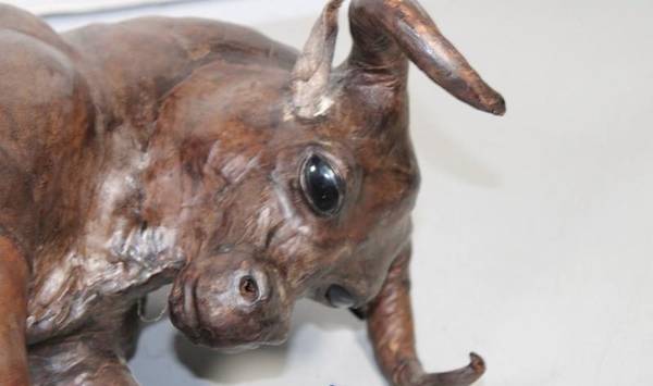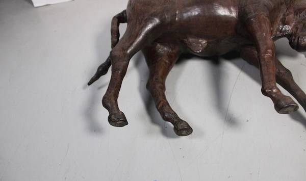 Large leather wrapped sculpture statue of an angry attacking bull -...