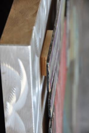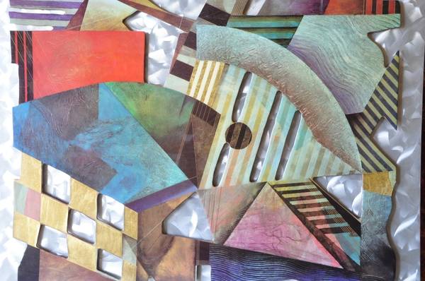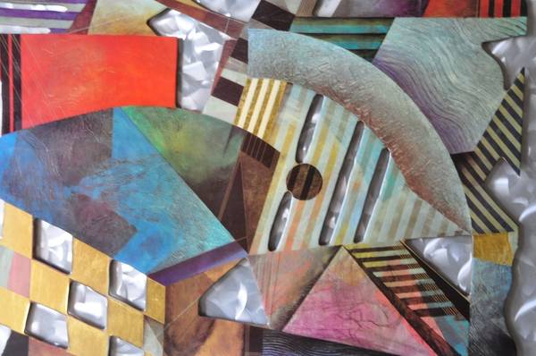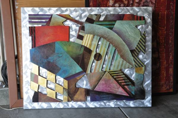 LOCATED IN SAN JOSE. This is a unique piece of abstract art by Richard Hall. It is titled "Circularity in Motion". The image itself is similar to his painting of the same name. However, it has been made by cutting multiple pieces of thick wood or acrylic pieces and mounting them on an aluminum sheet covered wood backing. The pieces are sticking out of the backing by some distance, giving a 3D effect. This cannot easily be copied. Asking $395 (OBO). It is 54" wide, 42" high and about 1.5" deep.