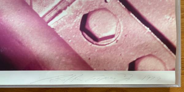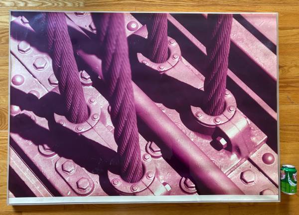 I have (four) rare extra large C-Print (color print) photograph of the Golden Gate Bridge by artist Ruffin Cooper Jr. All are limited edition, numbered (15/100) and are signed, titled and dated (1979) in the lower margin in pencil. Formerly in the (SF) Bank of America collection. This is one of several from a series (among other notable works is his series of the Statue of Liberty). These prints are on foam core backing and have a wood frame structure with acrylic framing. Titles: "Cable Close-Up", "Main Cable" "Four Cable Attachment" and "Corner"