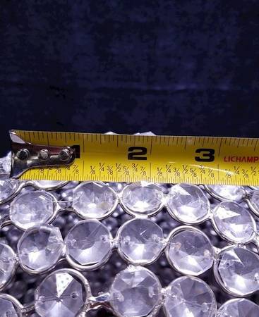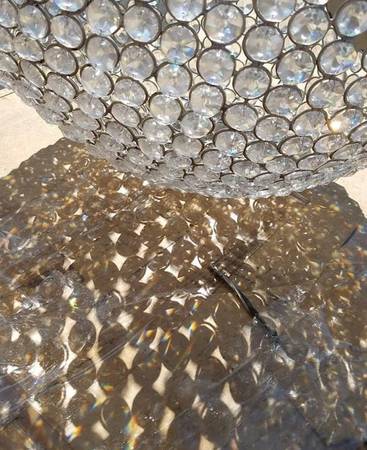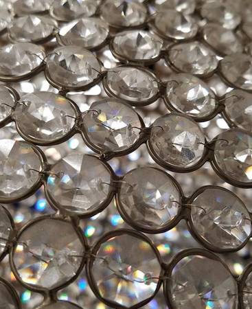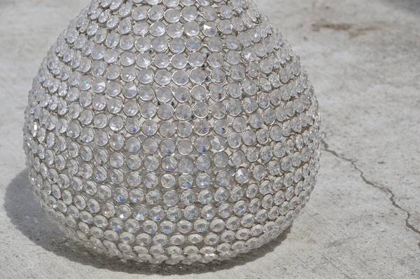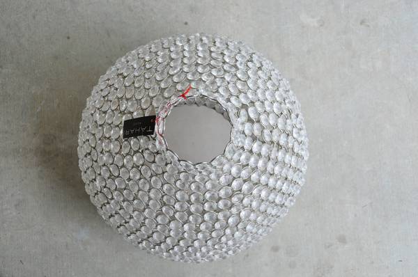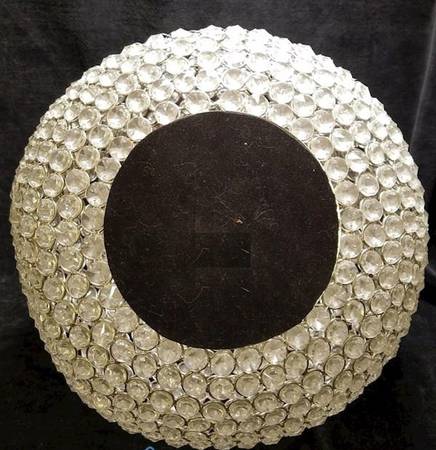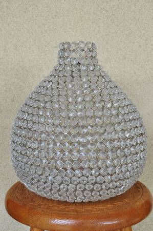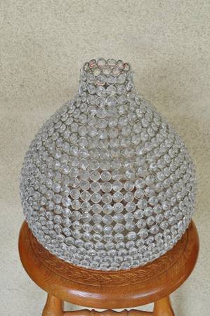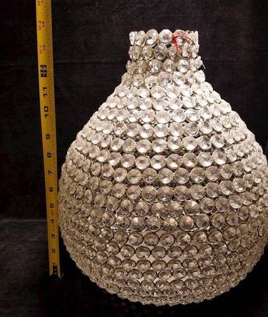 This is an unusual item made by assembly of many cut crustal glass pieces on a metal screen. The bottom is closed. It can be used as a vase or used as a lamp or chandelier shade. It is 13-1/2" high, 12" wide and weigh about 6 lb. The small top opening is about 2-3/4" wide. Asking $175 (Or make offer).