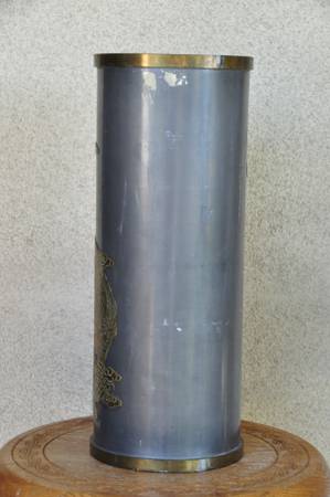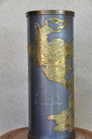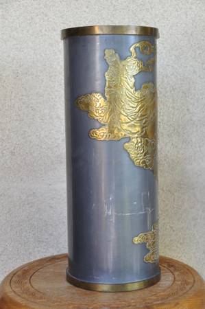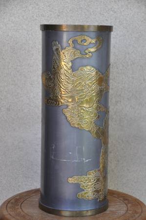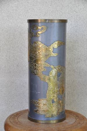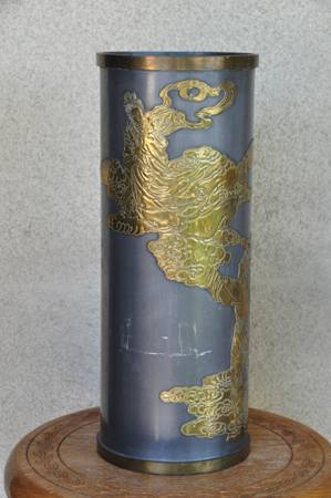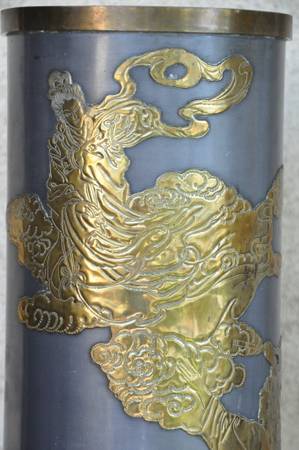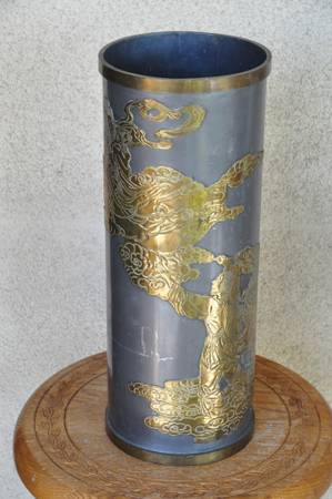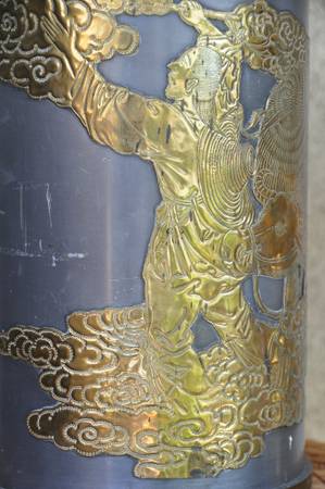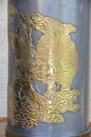 ITEM LOCATED IN SAN JOSE. This is an unusual vase made in Hong Kong. The brass overlay art shows a person looking up to a lady (possibly Guanyin). It is about 16" high, 6.5" in diameter and is quite heavy at 9 lb. Asking $150 (OBO).