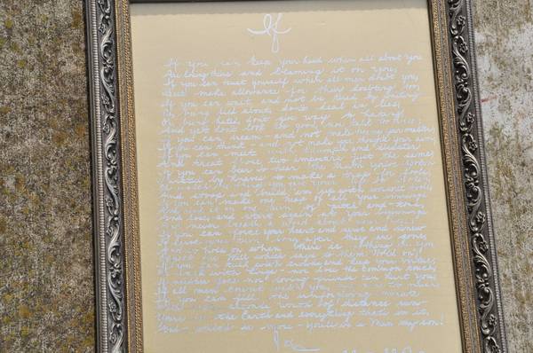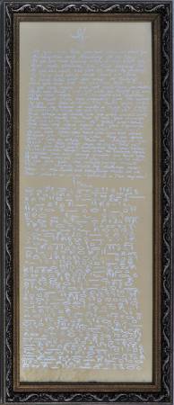 ITEM LOCATED IN SAN JOSE. This is an unusual artwork. There is cursive writing in English together with Egyptian hieroglyphic writing on parchment. I believe the upper English writing is a translation of the hieroglyphic writing below. The frame is 15"x32.5". Asking $225 (Or make offer).