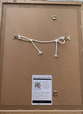 Features a magnolia flower in a simple, brushed silver wood frame. The petals have detailed brushwork and a stunning peach color with gray stems and leaves. A stamp sits directly underneath each print. A "William Stafford" mark is on the bottom right corner and the print number out of 295 sits on the bottom left. A more detailed description of the collection resides on the back of each frame.