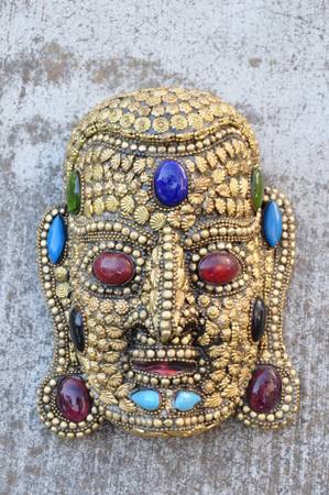 LOCATED IN SAN JOSE. These masks have metal relief features mounted on carved wood surface, and then decorated with cabochon gemstones of various colors. The larger mask is 9" wide, 11.5" high and 4" deep. The smaller mask is 7" wide, 9" high and 3.5" deep. Asking $275 (Or make offer) for the pair.