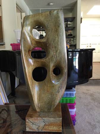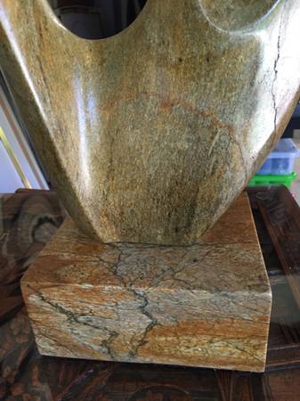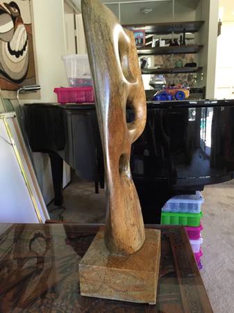 Soap Stone Sculpture, FINE ART. Beautiful Free Form Sculpture in Natural Soap Stone with Natural oil finish. Artist: John Richardson. Coloration: Swirls of black, gray, brown, rust, blue, and beige. Dimensions: Base: 6.25”d x 7”w x 3”h, Overall: 22”h x 9.5”w x 5” thick.