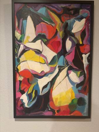 For sale is a beautiful and colorful original abstract painting by well-known Long Beach artist Deon Roberton. Originally purchased from an art cooperative in SF, but artist signature is hard to read. Bold black, magenta, pink, yellow, white, light blue, orange and green. Canvas is 36 inches high, 24 inches wide, with a simple black wood frame that add about an inch vertically and horizontally. Hard to find good original art of this size that is affordable.