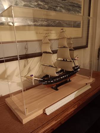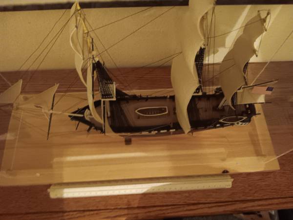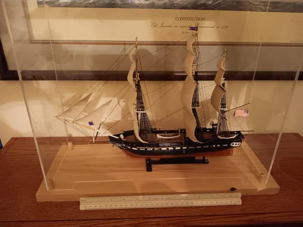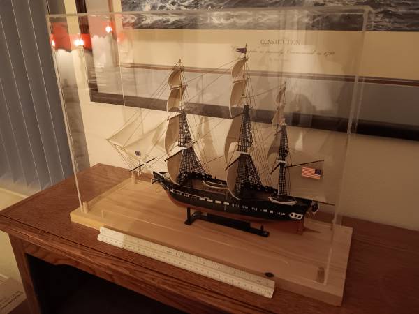 $55 or best offer. This 1:196 scale replica of the U.S.S. Constitution was built from a Revell kit. It measures 17" from stem to stern and is approximately 11" tall (see 13" ruler in foreground). Now at it's home port in Boston harbor, the actual ship remains the longest continuous serving vessel in the U.S. Navy. Nicknamed "Old Iron-Sides" by her awe-inspired British adversaries during the War of 1812, she was also known for her cutting edge design and firepower. This replica has full rigging and sails and comes with its own base and dust cover, ensuring many years of pristine appearance.