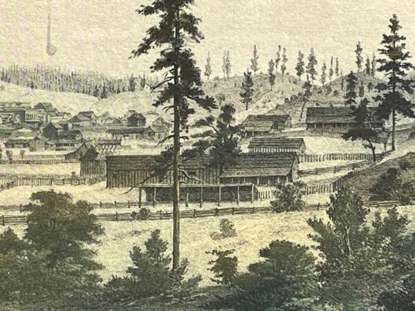 shasta cabin picture retro mt mountain illustration lithograph scott art arts artist Scotts Bar , on the Scotts River, Siskiyou County, California, 1856 (1937). Artist: Britton & Rey Charles Conrad Kuchel drawn by Kuchel & Dresel