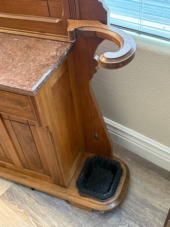 Beautiful Walnut Halltree with Burlwood accents, Stick and Ball detail, has marble top above drawer with cupboard below
