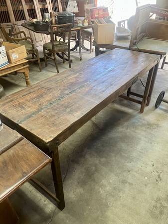 We have several beautiful one of a kind folding wedding tables from India. They would serve well as a sofa table, entry table, workstation or many other uses. Solid wood top with ladder style legs and metal supports. There are tin patches, nicks and scratches which all lead to its Old World charm! Very sturdy and functional for any use. And because they fold, they can be stored and moved easily.