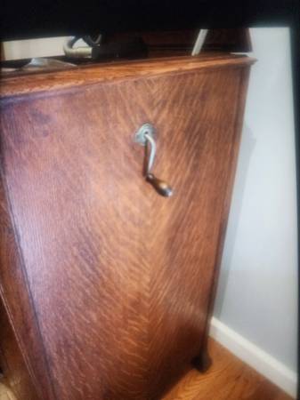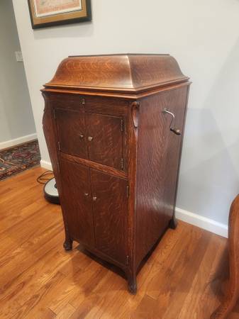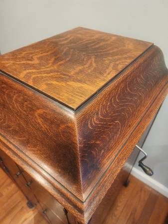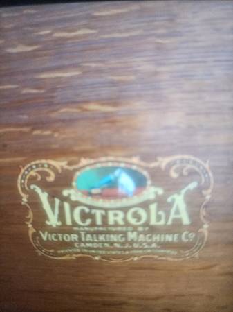 Antique Victor Victrola Talking Machine. Simply put, an old fashioned record player. Made back in 1910s. Last model with crank before they became electric. Needs repair. Includes original needles and crank. Beautiful golden oak with a tiger stripe wood finish. Delivery available. Thank you.
