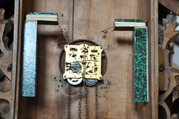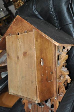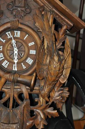 ITEM LOCATED IN SAN JOSE. This Hunter's clock has a carved horn flanked by a rabbit and a pheasant hunting trophies, atop a hunter's pouch. The wooden part is 29" high, 23" wide and 10" deep. It needs some maintenance to make it work well. Asking $1250 (Or make offer).
