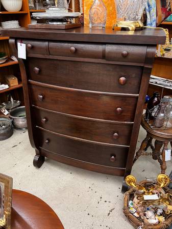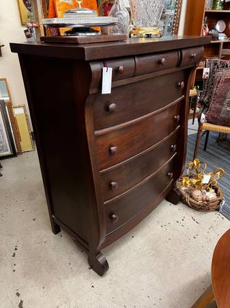 Just arrived! Very nice antique tall hiboy dresser, probably dating back to the 1800's. This one has 3 small drawers over 4 large drawers. Lots of storage! Made in USA.